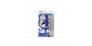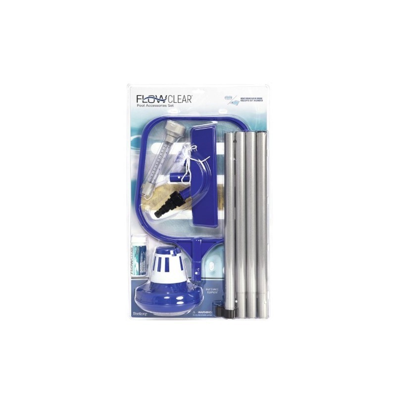 Set di Accessori per Piscina adatti a piscine da 3.66m 12’) o di dimensioni inferiori 58013 58013 KIT di MANUTENZIONE Include un’asta leggera con teste per aspiratore e setaccio intercambiabili L’aspiratore ha una testa pulente con sacco riutilizzabile per residui L’aspiratore si collega alla presa del giardino il setaccio ha una rete a maglia resistente per l'uso con piscine da 3.66m 12’) o di dimensioni inferiori 58071 GALLEGGIANTE CHIMICO Disperde e scioglie pastiglie di cloro e bromo Ghiera regolabile per il rilascio controllato dei prodotti chimici Tavolette non incluse 58142 STRISCE TEST per PISCINE e SPA Soluzione ideale per test di base dell'acqua di piscine e spa Strisce test 3 in 1: -Cloro libero -pH -Alcalinità totale Semplice sistema di abbinamento dei colori Misurazione del cloro libero da 0 a 10 ppm, dell'alcalinità da 0 a 240 ppm e del pH da 6,2 a 8,4 con risultati immediati Periodo di validità 18 mesi 62068 TOPPA di RIPARAZIONE RINFORZATA Pezze adesive da 42,3cm2