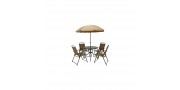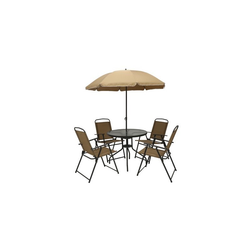 SET TAVOLO CON 4 SEDIE PIEGHEVOLI E OMBRELLONE Set da giardino composto da ombrellone, tavolo e 4 sedie. Struttura in acciaio. Sedie cm. 74x53x89h con schienale in textilene. Tavolo cm. ø 80x71h. con piano in vetro temperato spessore 5 mm. Ombrellone ø cm. 180 con telo in poliestere 160 gr/mq.