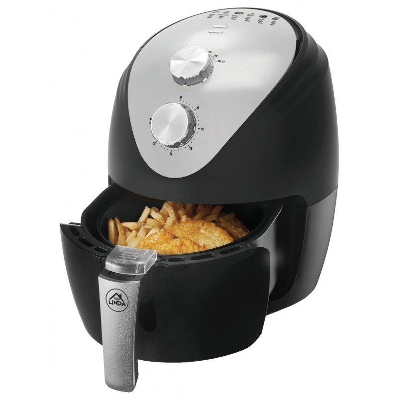 Capacità del cestello lt. 2,5, ideale per friggere verdure, carne e pesce. Recipiente esterno con maniglia, cestello antiaderente, rimovibile e lavabile, termostato regolabile da 80° C a 200° C, timer 30 minuti con autospegnimento, indicatori luminosi, gommini antiscivolo, cm. 31x26,5x31 h.