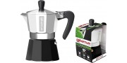 Corpo in alluminio pressofuso alto spessore, raccoglitore e caldaia alluminio finitura nero, manico antiscottatura in bakelite