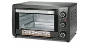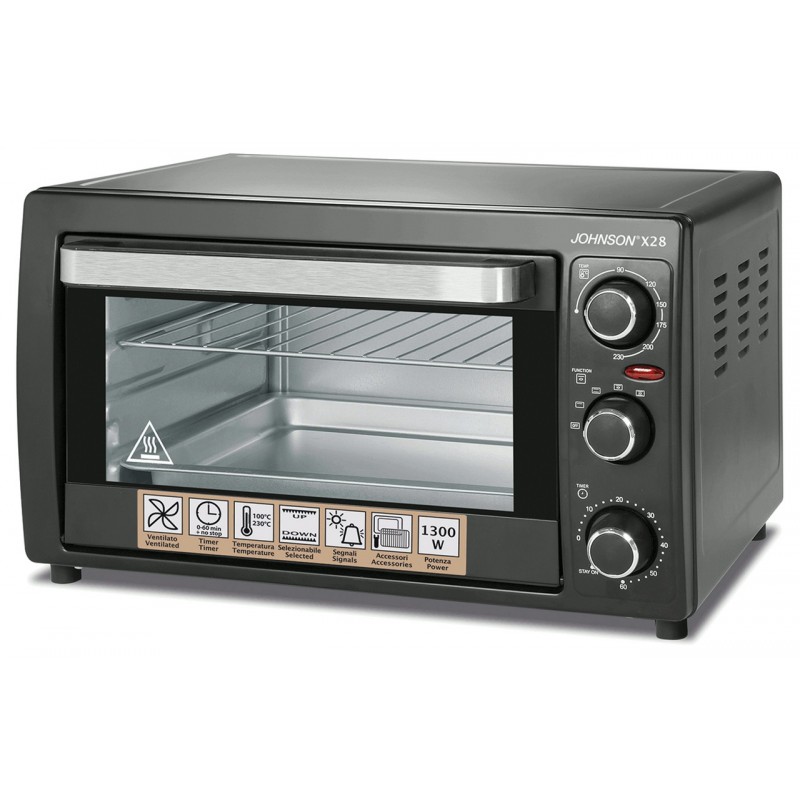 Capacità lt. 28, timer con segnale sonoro 0-60’, termostato regolabile 100÷230°C, funzioni: Base, Grill, Combinata, Ventilata, sportello con doppi vetri e pareti termoisolate, maniglia termoisolata, cm. 45,5x,37x27 h. Accessori: griglia, teglia e pinza.