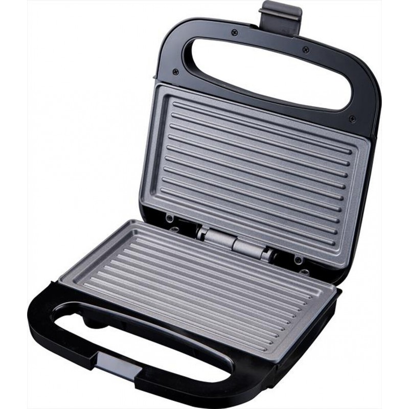 Potenza 750 Watt, piastre rigate antiaderenti, termostato fisso, lampada spia di funzionamento, riponibile in verticale.