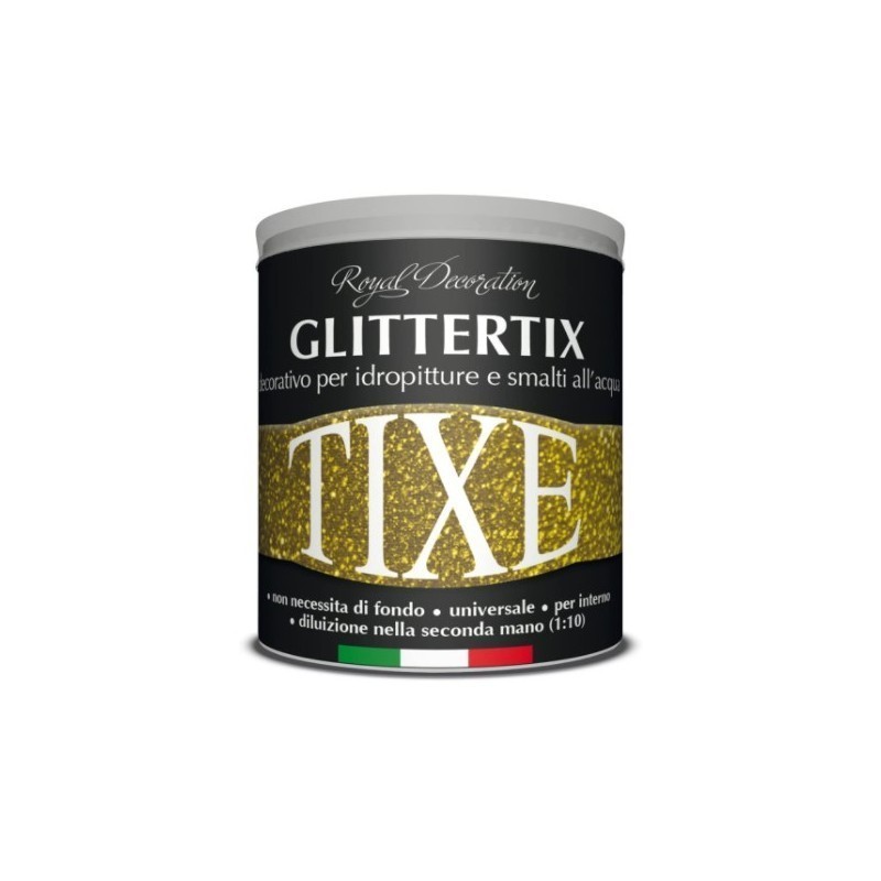 Tecnologia gel - il prodotto si presenta in una speciale emulsione neutra e non spolvera nell'ambiente durante l'utilizzo; inoltre gli speciali additivi permettono al glitter di brillare senza la necessità di passare un panno dopo l'applicazione; l'emulsione gel permette una distribuzione omogenea dei glitter all'interno dell'idropittura o dello smalto evitando la formazione di grumi Atossico e sicuro per i bambini - glittertix è conforme agli standard europei e 100% atossico e sicuro per i bambini; ottimo per far brillare la cameretta dei bambini, ma puoi usarlo anche per la sala da pranzo, la cucina e perchè no, anche per il bagno Compatibilità universale con prodotti all'acqua - glittertix non va usato direttamente ma deve essere aggiunto in prodotti a base acqua: una comune idropittura neutra o colorata, un flatting all'acqua o uno smalto all'acqua di tutte le tonalità; puoi usarlo sulle pareti, ma anche per mobili ed oggetti in legno e metallo Facile da usare - le pareti brilleranno in un attimo versa glittertix nell'idropittura o smalto prescelto in un rapporto 1/10 (glittertix rodotto ad acqua in volume), ricordando che il rapporto può variare per decorazioni più o meno vistose ed il gioco è fatto Effetto glitterato - glittertix produce un effetto decorativo fatto di molteplici punti di luce riflessa; può sostituire la carta da parati, oppure ideale per decorare e accendere di luce le pareti bianche o colorate di casa tua; e' un'applicazione divertente per bambini ed adulti