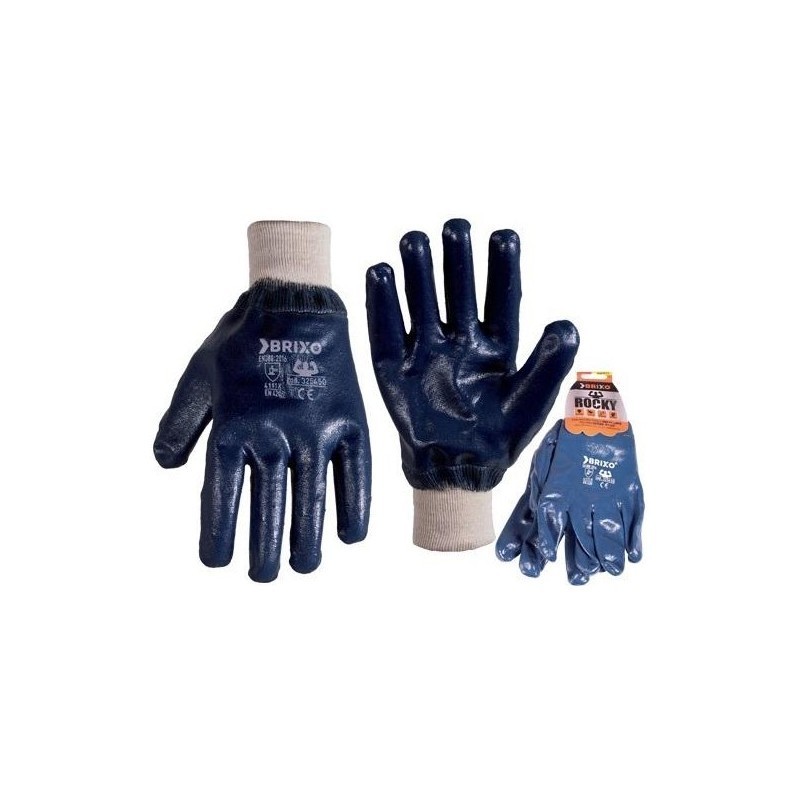 Dorso cotone jersey, palmo NBR pesante spalmatura totale con polsino. Intersamente ricoperto, ottima resistenza alle abrasione, idrocarburi, oli e grassi. Polso elasticizzato. Utilizzi: lavori stradali, manutenzione generale, industria meccanica, lavorazione di metalli o similari poco taglienti e abrasivi. Certificazioni EN 420 - EN 388 4121. Taglia XL