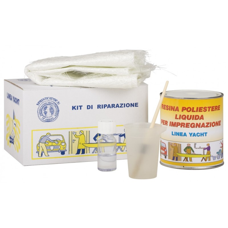 Resina e lanavetro separati incluso catalizzatore. Indicato nel settore nautico o per la riparazione di manufatti in vetroresina. Composizione del kit: 0,750 Lt. - resina poliestere con catalizzatore - 0,5 mq. lanavetro in tessuto - 1 bicchiere - 1 pennello - 1 guanto monouso.