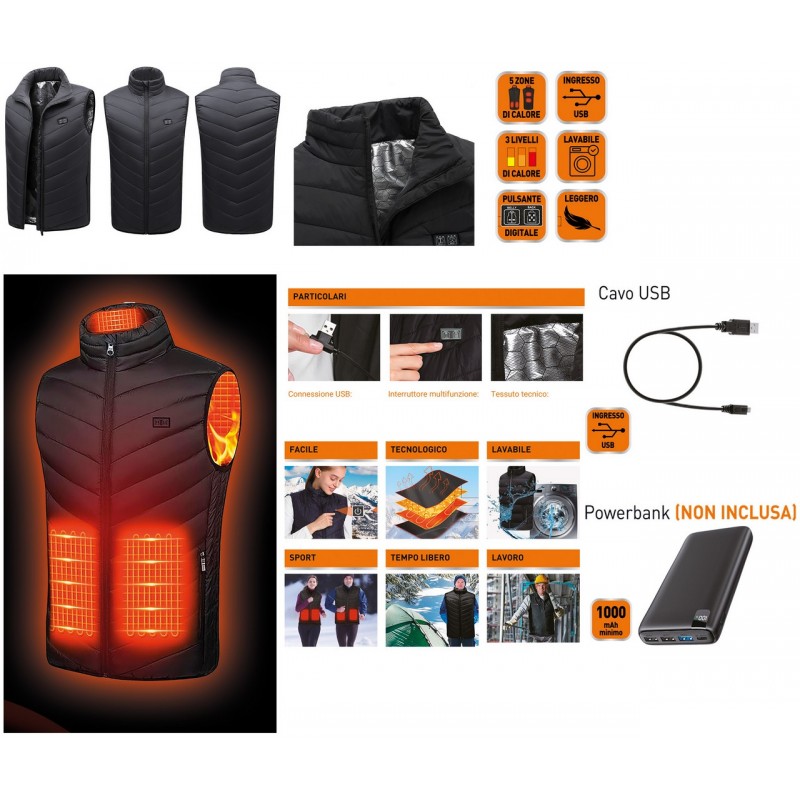 Doppio interruttore ch epermette di regolare zone e riscaldamento, 5 zone di riscaldamento, 3 livelli di calore, lavabile in lavatrice, cavo USB per la ricarica in dotazione.