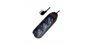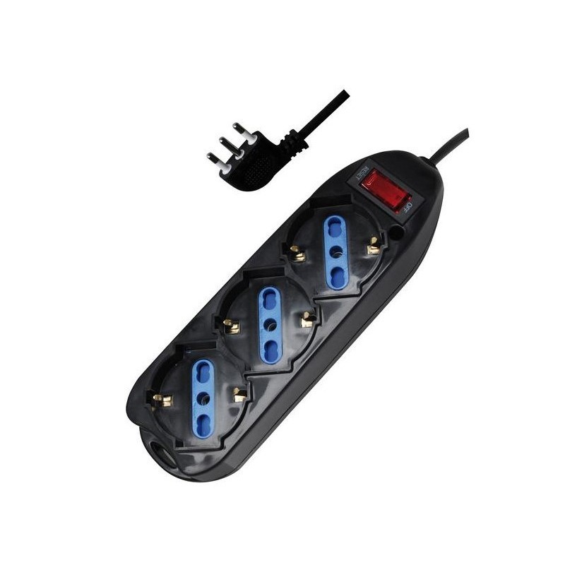 Multipresa 3 prese Schuko/Bipasso - Spina 16A a 90° Lungh. cavo: 1,5 m Colore: nera Dati elettrici e meccanici: Sezione cavo: 3x1,0 mm² Altri dati: Note: Massimo carico supportato 3500W Con interruttore con Protezione da Sovraccarico