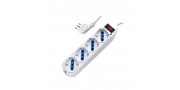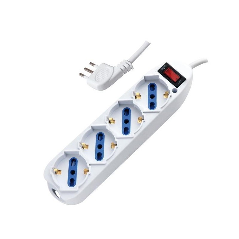 Multipresa 4 prese Schuko/Bipasso - Spina 10A (2P+T) a 90° Lungh. cavo: 1,5 m Colore: bianca Dati elettrici e meccanici: Sezione cavo: 3x1,0 mm² Altri dati: Note: Massimo carico supportato 2500W Con interruttore con Protezione da Sovraccarico