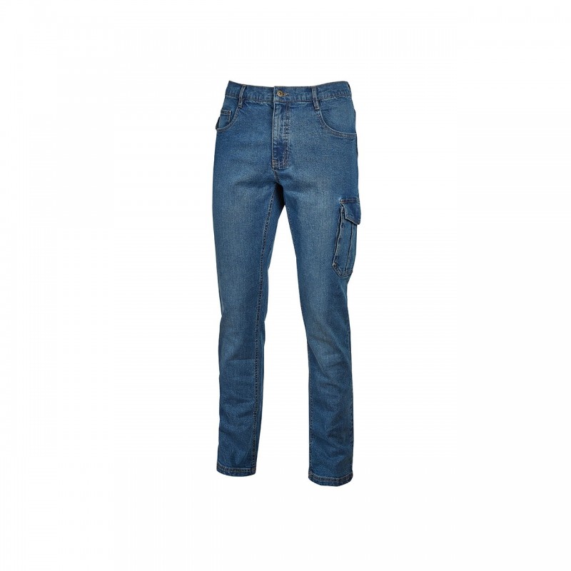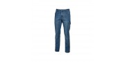 Jeans 5 tasche elasticizzato con tascone laterale, tasca porta metro e fettuccia porta martello. Vestibilità slim-fit. Nastro rosso/reflex su passante tubolare posteriore. Zip YKK.