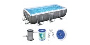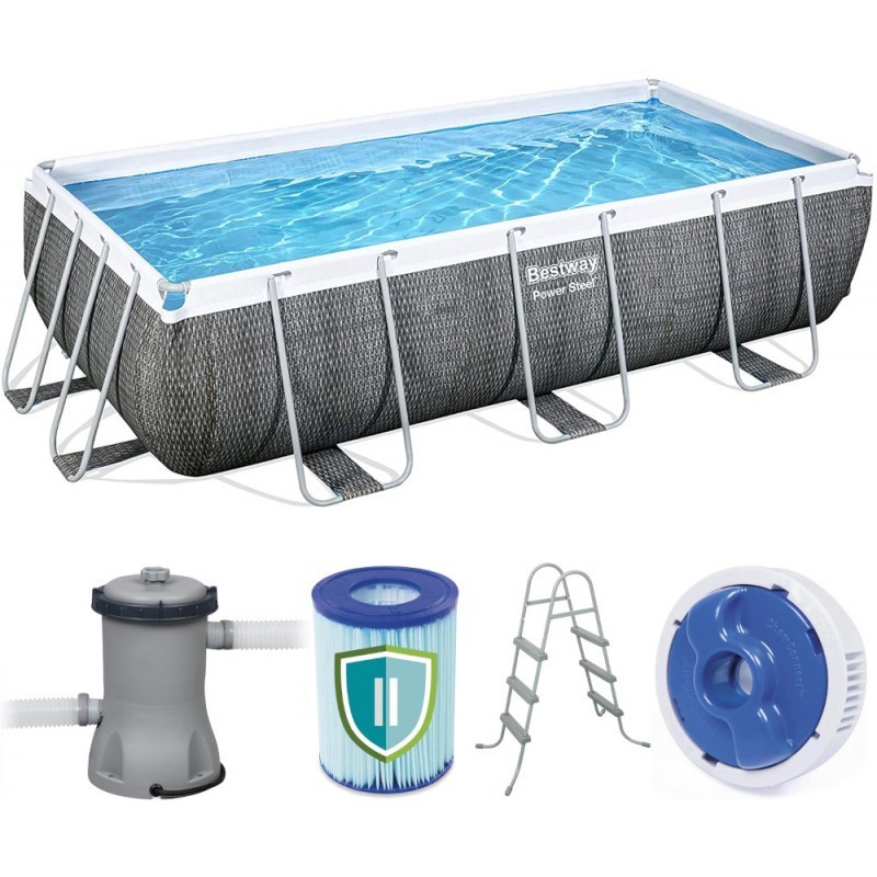 Piscina Fuori Terra Rettangolare, 404X201X100 cm, Pompa di Filtraggio e Dosatore Chemconnect Inclusi, Effetto Rattan Grigio. Design e Materiali: Effetto rattan grigio scuro, La stampa realistica della parete esterna della piscina conferisce al tuo cortile un'atmosfera calda e di classe. Tecnologia Tritech™: L'esclusivo materiale formato da due strati di PVC con al centro una maglia di poliestere. SISTEMA DI FILTRAZIONE A CARTUCCIA FLOWCLEAR™: Richiede pochissima manutenzione ad un prezzo davvero contenuto. La cartuccia va sostituita ogni 15 giorni. SISTEMA SEAL & LOCK™: L'avanzato sistema antiruggine in grado di aumentare del 75% il grado di resistenza alla corrosione. Frosted Finish: La tecnologia che impedisce alla vasca di attaccarsi alla struttura in acciaio in caso di temperature elevate.