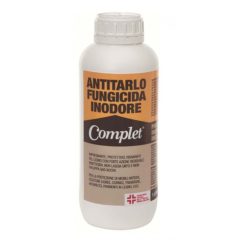 Complet è l'antitarlo fungicida protettivo inodore e incolore, studiato e prodotto in italia con presidio medico chirurgico registrato presso il ministero della sanità nr. 18563. Formulato speciale per la protezione di mobili antichi, sculture lignee, cornici, arcarecci, travature e pavimenti in parquet. Complet è utilizzabile a pennello, a spruzzo, ad immersione, ad inoculazione, ad impregnazione e sottovuoto. Non sciluppa gas nocivi nè provoca allergie per l'operatore. Non è corrosivo per metalli e leghe. Non danneggia la lucidatura a cera o a gommalacca. Non lascia alcuna untuosità o residui.