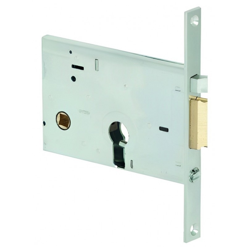 Per fasce di profilati metallici, con quadro maniglia, scrocco autobloccante, cilindro sagomato, frontale 16 mm., entrata 58 mm., fermo a giorno. Cilindro sagomato non in dotazione.