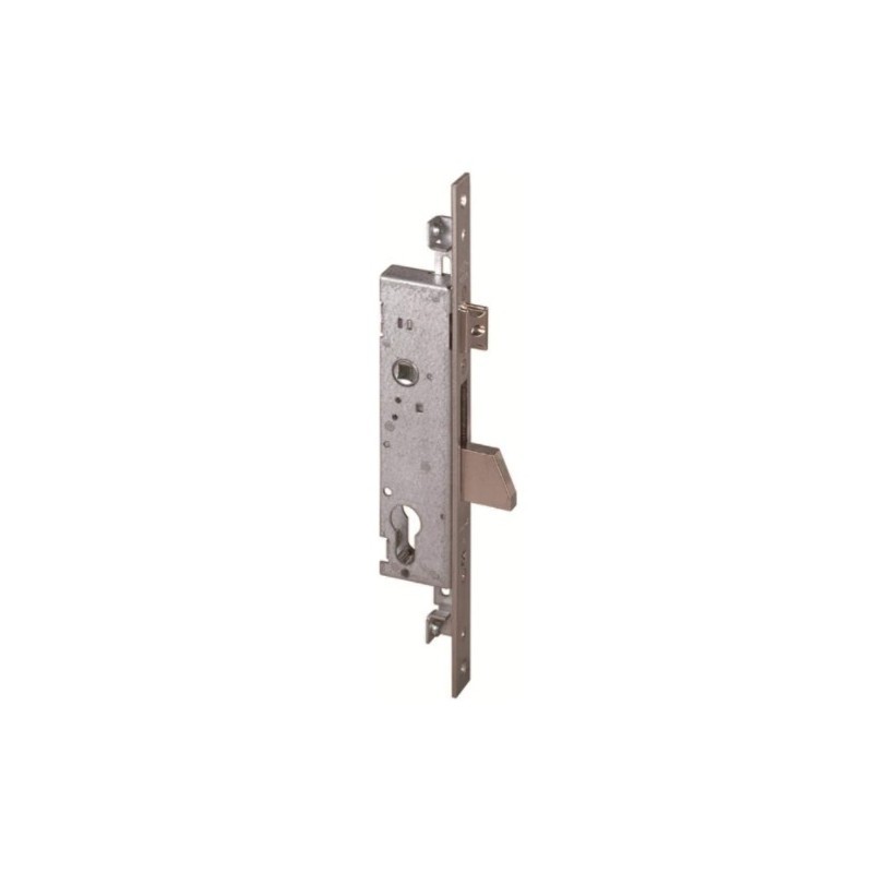 Caratteristiche tecniche: • Entrata: 30 • Frontale: mm.22x290 • Scatola in acciaio con rivestimento in zinco • Frontale in acciaio inox • Scrocco, rullo, catenaccio e gancio nichelati • Scrocco o scrocco/pistone reversibile (dove previsto) Dotazione: • Coppia spessori sottofrontale in nylon art. 1.06141.65.0 • Viti di fissaggio serratura e cilindro • Foglio istruzioni Descrizione: • Catenaccio e scrocco • Scrocco regolabile da 11 a 17 mm. • Predisposizione per chiusure supplementari • Coppia borchie in nylon art.1.06012.01.0 • Perni filettati per il fissaggio delle prolunghe • Fornita senza cilindro profilo europeo (0G300)