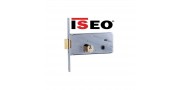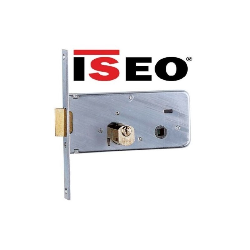 Serratura da infilare Iseo 712 Per fasce di profilati metallici, a 2 mandate con scrocco, quadro maniglia e cilindro tondo, testata 16 mm., entrata 60 mm.; In dotazione: cilindro, 3 chiavi, vite di fissaggio cilindro, 2 ghiere in nylon.
