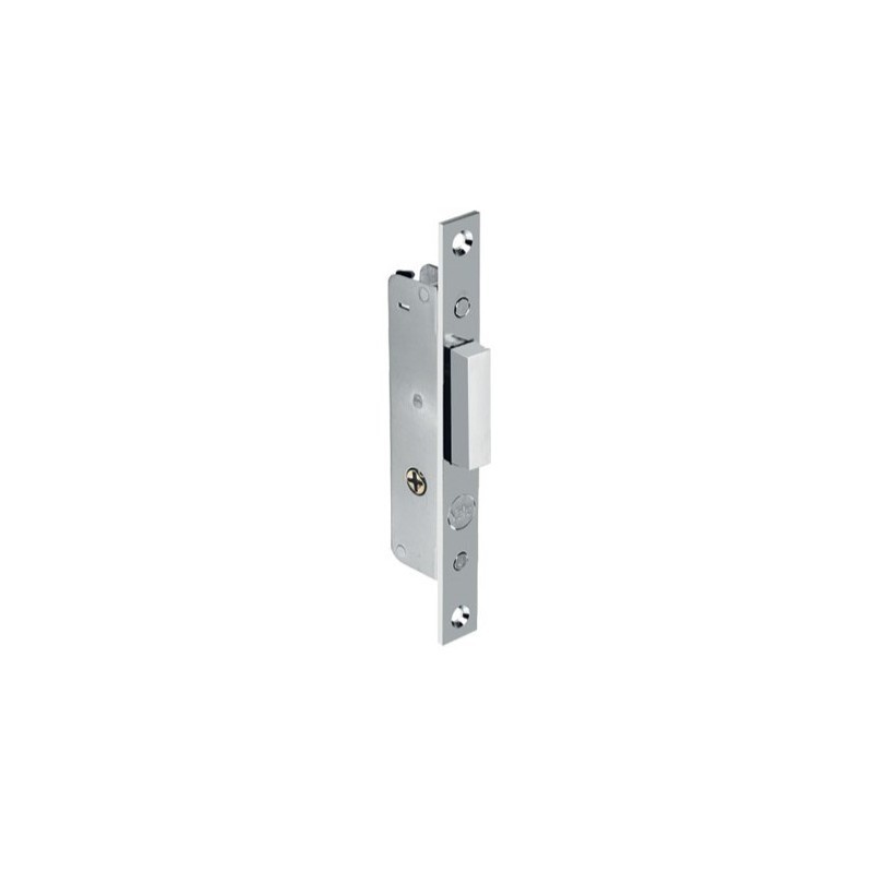 Con cilindro a croce. Chiusura con catenaccio avanzante a 1 mandata. Frontale in acciaio nichelato con bordo quadro da Mm. 16x148. Altezza scatola Mm. 103. In dotazione: 3 chiavi, contropiastra, 2 mostrine in plastica e viti di fissaggio.