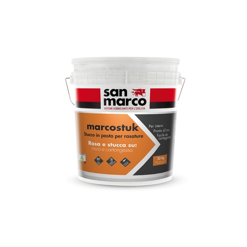 Stucco bianco pronto per rasature fini e lisce di superfici all'interno in intonaco, gesso e cartongesso, calcestruzzo e legno, nuove o già verniciate. Altamente riempitivo, rasa e stucca piccoli buchi o fessure. Grazie alla facilità di applicazione a strati sottili sovrapposti e all'elevata carteggiabilità, MARCOSTUK risulta indicato anche per ampie superfici.