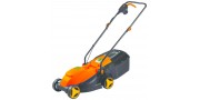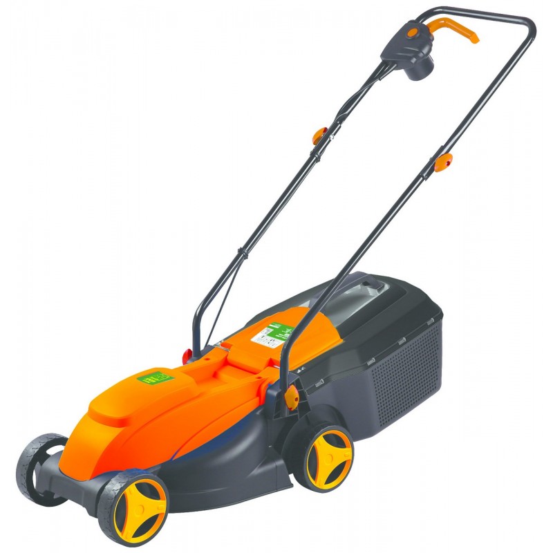 Scocca termoplastica. Motore elettrico 1000 Watt, max taglio Ø 32 cm. altezza taglio 25-65 mm., 3 posizioni, capacità sacco Lt. 25, consigliato per aree di 250 mq.