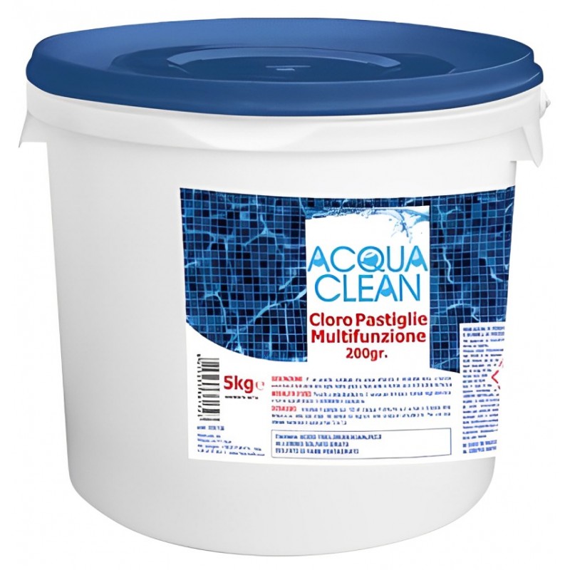 Agente clorante - Antialghe - Flocculante in pastiglie da 200 grammi. Prodotto combinato che uscine all'azione di clorazione lenta, un'azione preventiva di distruzione delle alghe. Inoltre grazie al flocculante contenuto aiuta la filtrazione dell'acqua. Prodotto a lenta dissoluzione, idoneo per immissioni manuali negli skimmers o tramite appositi dosatori ad aspirazione. Immettere 5 pastiglie ognni 100 m³ d'acqua. Il consumo può variare in funzione della temperatura, della luce solare, del numero dei bagnanti e delle condizioni atmosferiche. Per una resa ottimale, mantenere il valore del PH tra 7,2 e 7,6.