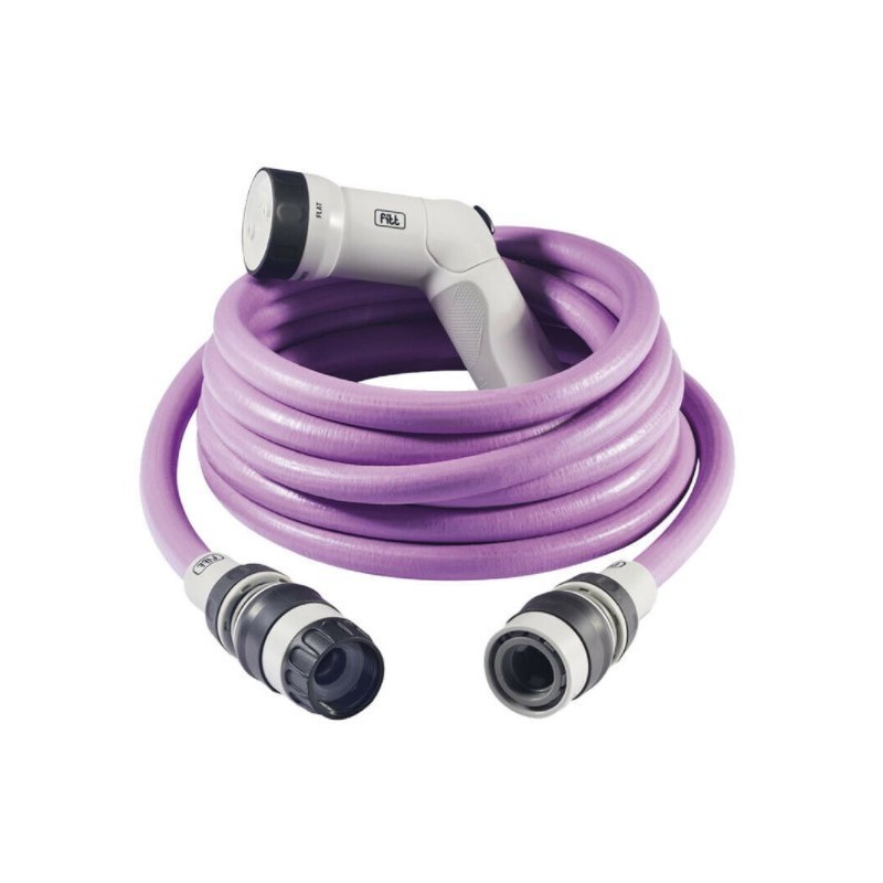 Tubo estensibile NTS 6 strati - Ø interno 9,8 mm. - Ø esterno 14,7 mm. Pressione 18 Bar. Strato interno - intermedio - sottostrato in elastomero (TPE) con agente scivolante per migliorare e favorire il flusso d'acqua che conferisce al tubo la capacità di estendere e allungarsi in modo elastico. Strati di ilati di poliestere a maglia e intrecciati (PET). Strato esterno di copertura colorato in elastomero (TPE) resistente all'invecchiamento. In dotazione 2 raccordi a scatto (1 acquastop) e presa rubinetto 1"-3/4", pistola multigetto (4 tipologie di getto), impugnatura in gomma antiscivolo.