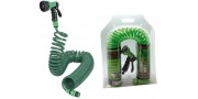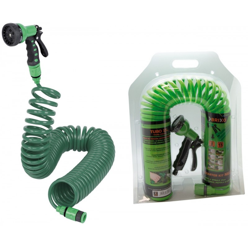 Kit irrigazione composto da 15 mt di tubo in EVA (Etil Vinil Acetato) spiralato, dotato di 2 mraccordi matic da 1/2", pistola multifunzione con 8 modalità (angolo - piatto - cono - totale - nebbia - caduta - centro - doccia) + presa rubinetto 1/2" e 3/4".