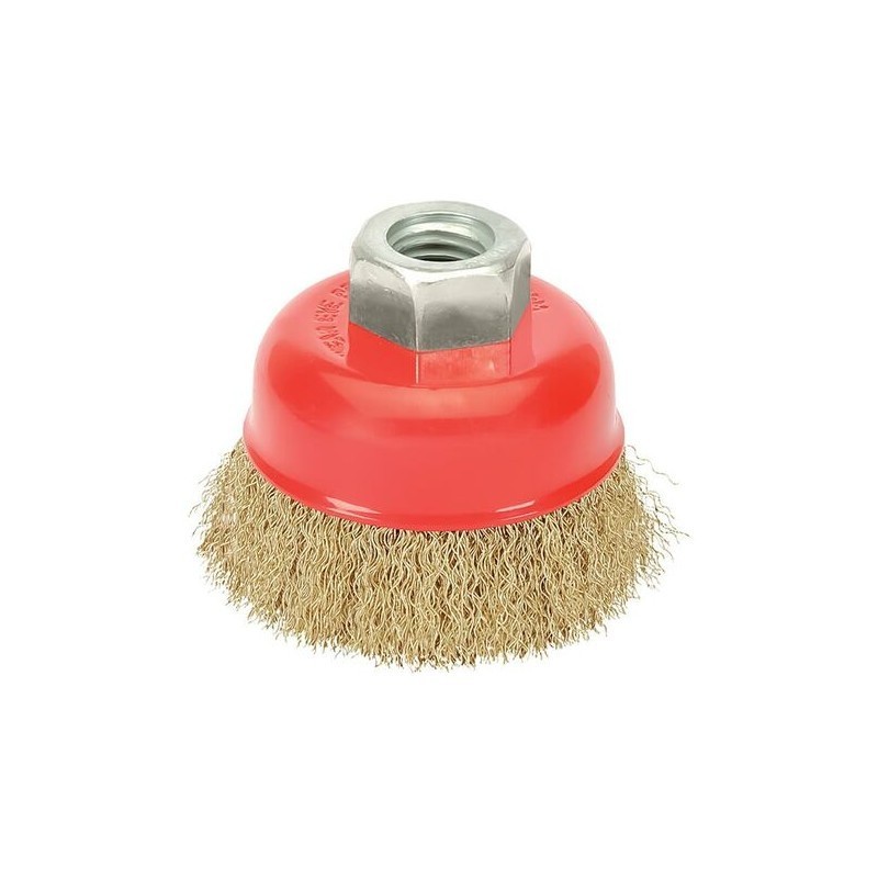 Spazzola a Tazza in acciaio ondulato M14 In filo di acciaio ondulato ad alta resistenza e ad altissima densita' di filamento. Adatte per lavori di sbavatura, satinatura e lucidatura. diametro 65mm lunghezza filo 32 mm foro 14 mm