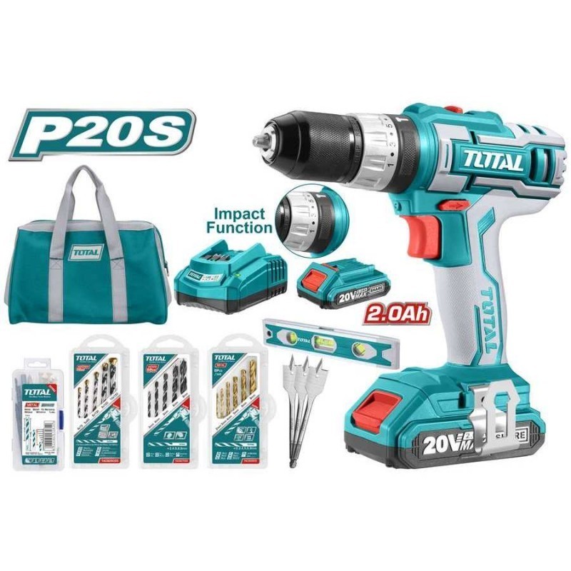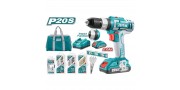 Voltaggio: 20V; Velocità a vuoto: 0-400 / 0-1500 giri/min; Coppia di Serraggio: 45nm; Mandrino Autoserrante da 0,8-10 mm; Impostazioni di coppia: 15 + 1; Cambio meccanico a 2 velocità; Funzione di blocco del mandrino; Con luce di lavoro a LED; Indicatore di carica della batteria; Batterie 20V agli ioni di litio 2.0Ah. Include: 2 Batterie; 1 caricatore: tempo di carica 1 ora; 42 accessori e punte; Borsa di Tela per il trasporto.
