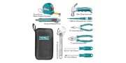 Include: 1 flessometro; 1 cacciavite a croce PH1 - 5x100mm; 1 cacciavite a taglio SL5.5 - 5x100mm; 1 chiave regolabile; 1 pinza a becchi lunghi; 1 pinza combinata; 1 taglierino; 1 cacciavite cercafase; 1 martello.