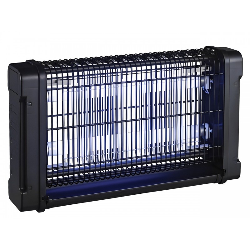 Elettrosterminatore a basso consumo, struttura in ABS materiale ignifugo, 2 lampade UV-A, raccoglitore estraibile posto alla base, da appoggio ed appendibile.